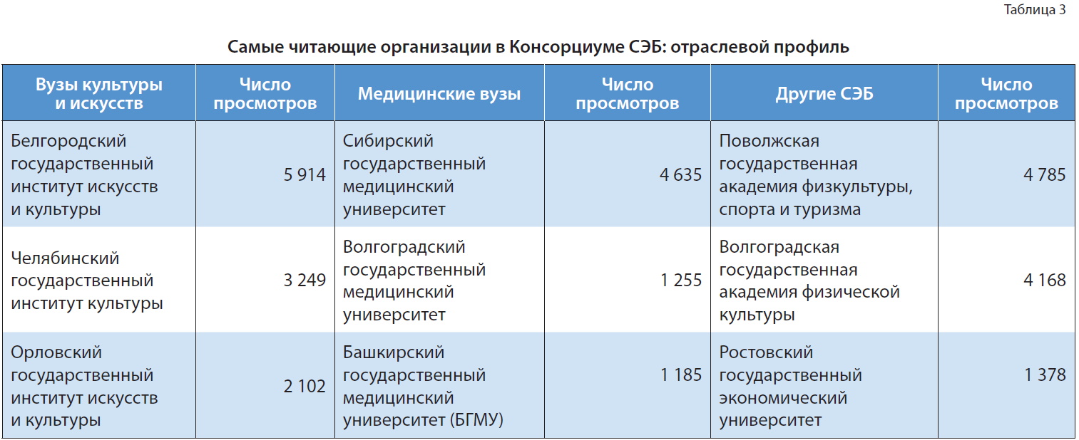 Так выглядит топ-25 наиболее активных участников Консорциума СЭБ. Как же распределились самые читающие организации в Консорциуме СЭБ по отраслевому профилю?.. Это участники СЭБ технических вузов (6), СЭБ аграрных вузов (10), СЭБ педагогических вузов (2) и СЭБ классических университетов (7). В остальных СЭБ тоже есть свои лидеры, которые не попали в общий рейтинг самых читающих организаций Консорциума СЭБ во многом из-за того, что эти отраслевые электронные библиотеки были созданы позднее (табл. 3).