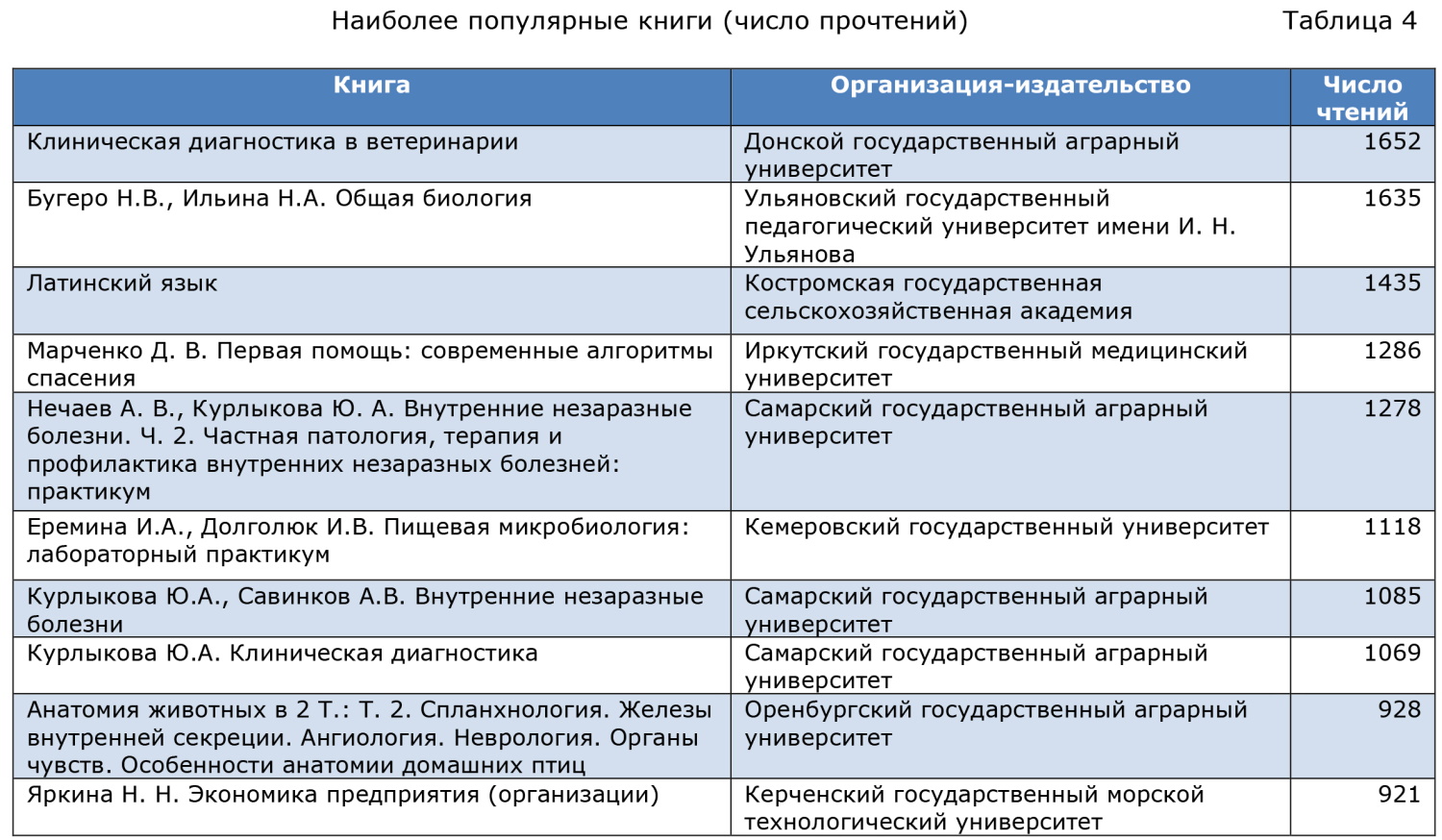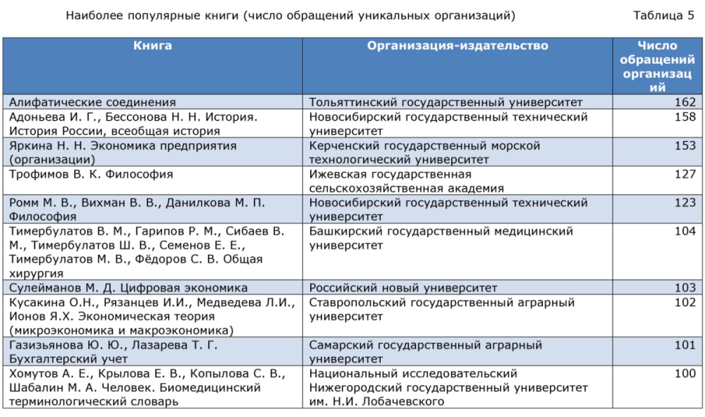 По результатам мониторинга 2021 г. чаще всего читатели вузов обращались к изданиям по химии, ветеринарии, биологии, философии, иностранным языкам, экономике. В табл. 4 приведены наиболее популярные книги в фонде Консорциума СЭБ на основе количества прочтений, а в табл. 5 — на основе количества обращений уникальных организаций.