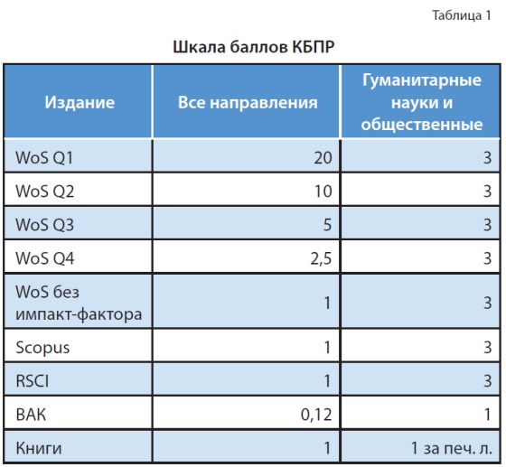 В значительной степени на решение этих проблем было ориентировано введение в 2019 г. в систему отчётности Министерства науки и высшего образования РФ комплексного балла публикационной результативности (КБПР). Этот показатель учитывает качество журнала и рассчитывается фракционным методом. Организация сдаёт отчёт, в котором публикация расписывается на каждого автора из числа сотрудников. В каждой строчке указывается, сколько всего авторов, сколько аффилиаций у каждого из них, где журнал индексируется и какой у него квартиль. Если у публикации несколько авторов, то каждый из них получает соответствующую долю оценки публикации (например, 1/2, 2/3, 3/5). Если у автора (авторов) несколько аффилиаций, то доли считаются с их учётом. В зависимости от уровня журнала используется шкала баллов, представленная в табл. 1. Этот показатель стал основой для формирования государственных заданий научных институтов.
