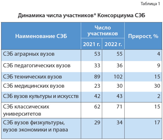 В сравнении с 2021 г. число участников Консорциума СЭБ в 2022-м увеличилось во всех отраслевых группах (табл. 1). Самый большой прирост новых участников в 2022 г. наблюдается среди медицинских вузов (+30%). Увеличение на 15% и более продемонстрировали СЭБ вузов физкультуры и вузов экономики и права в совокупности, СЭБ классических университетов и СЭБ технических вузов. В целом количество университетов в Консорциуме СЭБ за год выросло с 331 до 376.