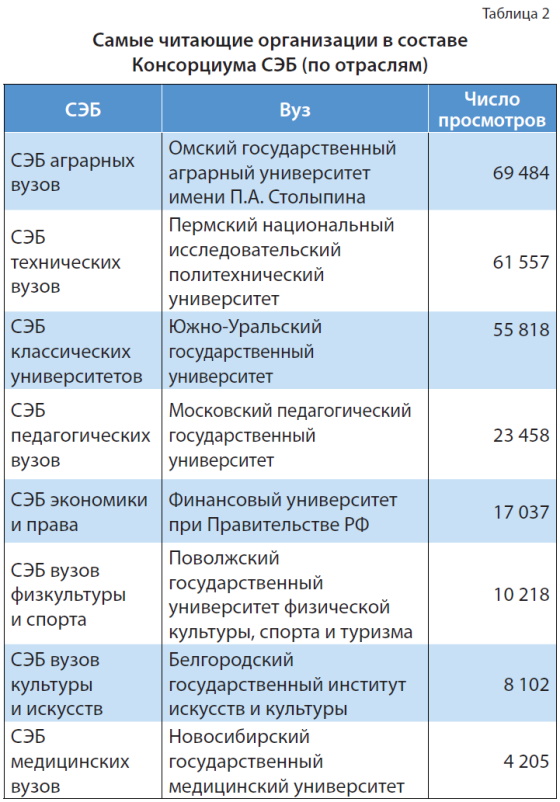 В каждой отрасли по результатам прошедшего года определился лидер по числу просмотров размещённого в общем фонде контента. Указанное в табл. 2 количество просмотров означает, сколько раз пользователи из данного вуза обращались к изданиям в Консорциуме СЭБ.
