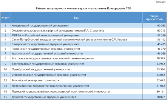 Рейтинг вузов, чей контент оказался самым востребованным среди других участников Консорциума СЭБ в 2022 г., содержит 15 организаций. Они представлены в табл. 6.