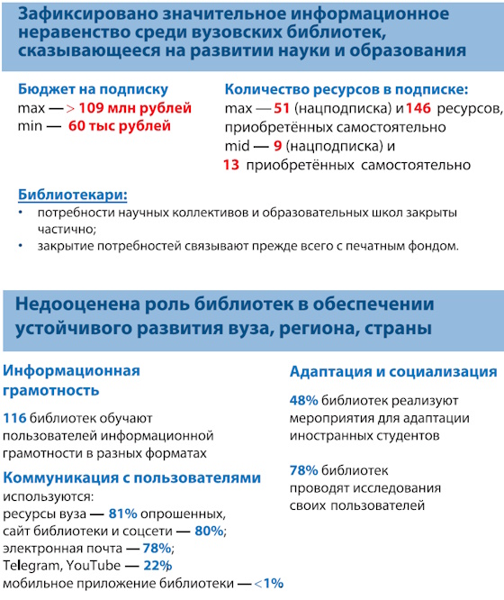 — Благодаря проведённому опросу стало очевидным, что вузовские библиотеки делают ного для обеспечения устойчивого развития вуза, страны, региона. Но их потенциал в этом плане, к сожалению, руководством пока недооценён.