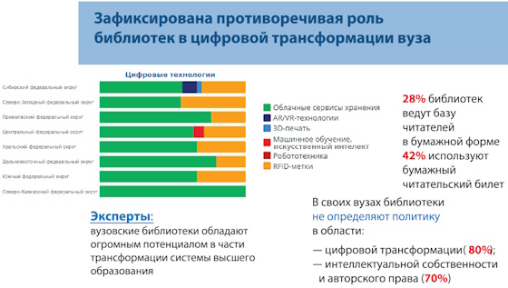 — Долгое время цифровая трансформация была приоритетным направлением движения вузов и определения места библиотек в этой области. Анализ показал, что, к сожалению, это не всегда замечают руководители вузов, но на самом деле роль библиотек довольно велика и владение соответствующими технологиями, на которые опирается цифровая трансформация вуза, во многом сосредоточено в библиотеках. Я говорю об облачных сервисах хранения. Мы наблюдаем эксперименты с VR-технологиями, машинным обучением, робототехникой, но ключевое — именно работа с массивами данных и облачные сервисы хранения. Они сегодня сконцентрированы в библиотеках, и об этом следует говорить, писать, совершенствовать такие сервисы, поскольку именно они создают прекрасную основу для решения вопросов цифровой трансформации в целом системы высшего образования. Работа с данными как раз та ниша, в которой мы можем активно развиваться.