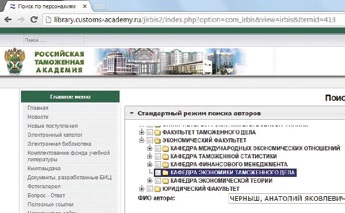 ВБИЦ академии регулярно проводятся мероприятия по дальнейшему развитию новой автоматизированной библиотечно-информационной системы. В 2014 г. на основе опыта коллег из Научно-медицинской библиотеки Сибирского государственного медицинского университета (г. Томск) принято решение о введении авторитетных файлов индивидуальных авторов для связи с профилем конкретного учёного Российской таможенной академии в ИАС «Карта российской науки»[1] и с Российским индексом научного цитирования (РИНЦ)[2]. На сайте Библиотечно-информационного центра реализована возможность просмотра профиля учёных РТА с указанием списков публикаций и перечня работ, размещённых в электронной библиотеке академии.