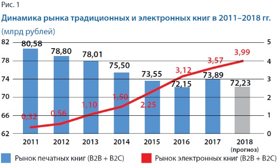 Комментируя ситуацию с формированием фондов вузовских библиотек, представитель компании EBSCO по СНГ Андрей СОКОЛОВ отметил, что рынок цифровых книг уже стал новой реальностью. Согласно отраслевому докладу «Книжный рынок России», объём рынка печатных изданий неуклонно сокращается, в том время как ёмкость электронного сегмента — растёт (рис. 1).