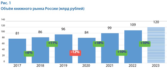 — Мы уже привыкли говорить о том, что год был непростой. Но 2022-й стал в этом отношении особенным, а времена пандемии, которые нас так нервировали, сейчас воспринимаются с лёгкой ностальгией. В денежном отношении рынок существенно подрос: на 10%, но, к сожалению, это произошло из-за роста себестоимости производства книг (рис. 1). Ощутимым было увеличение цен на бумагу и полиграфию, связанное с изменениями внешних обстоятельств. Мы были вынуждены оперативно перестраиваться на поставки материалов из Китая с увеличением стоимости логистики. При этом китайские партнёры сейчас продают мелованную бумагу дороже, чем европейские производители. Серьёзно сказался фактор инфляции: рост зарплат, тарифов — всё это привело к повышению себестоимости на 25–30%. Издатели пытались демпфировать часть этого подорожания. В первую половину года продавался ассортимент, накопленный на складах в 2020–2021 гг., что позволило ограничить рост цен: повышение не превысило 15%. К концу года, по мере вымывания ассортимента, рост цен составил почти 20%.