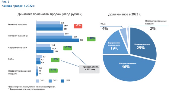 Просели независимые книжные, выросла федеральная сеть «Читай-город — Буквоед». Но в основном это восстановительный рост: число новых магазинов увеличилось всего на 25. Небольшой рост показали FMCG-сети, в основном за счёт лоукостеров, таких как Fix Price, куда книги активно проникают.