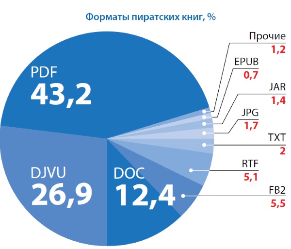 Указана доля каждого формата э-книг в общей массе пиратского контента, выявленного ассоциацией «Русский щит» в течение 2011–2014 гг. Следует учесть, что файлы в наиболее популярных форматах pdf и djvu могут содержать как нераспознанные, так и распознанные страницы с текстом книги. В большинстве случаев распознавание пираты не производят.