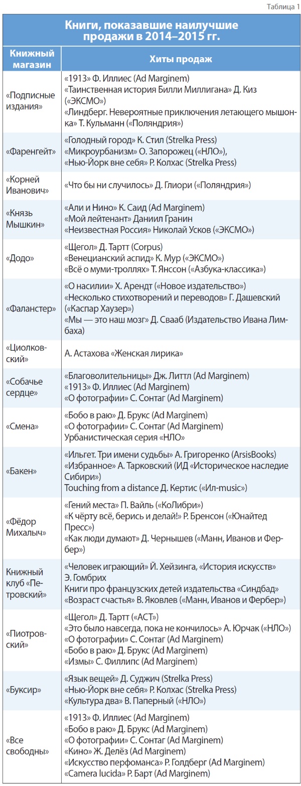 Практически отсутствует закономерность в отношении хитов продаж (табл. 1). Лучше остальных в сезоне 2014/15 продавались книги издательств Ad Marginem, Strelka Press и «НЛО»; «Щегол» Д. Тартт, а из детской литературы — сборник «Всё о муми-троллях». Провальными были названы издания по истории и филологии.