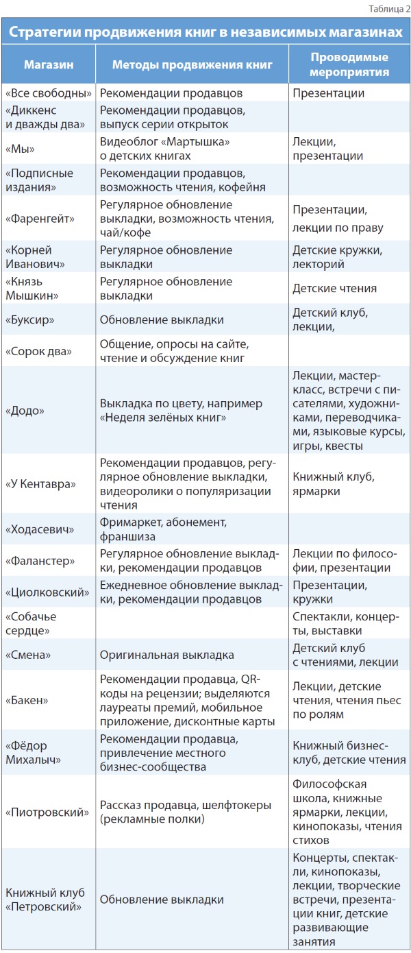 Как показал опрос, все респонденты регулярно меняют выкладку и стараются как можно больше читать свой ассортимент: личная рекомендация всегда срабатывает. Самые популярные стратегии продвижения представлены в табл. 2.