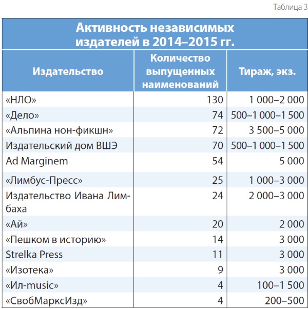 Издательства — участники опроса в 2014–2015 гг. выпустили от четырёх до 130 наименований книг тиражами от 100 до 5 тыс. экземпляров (табл. 3).