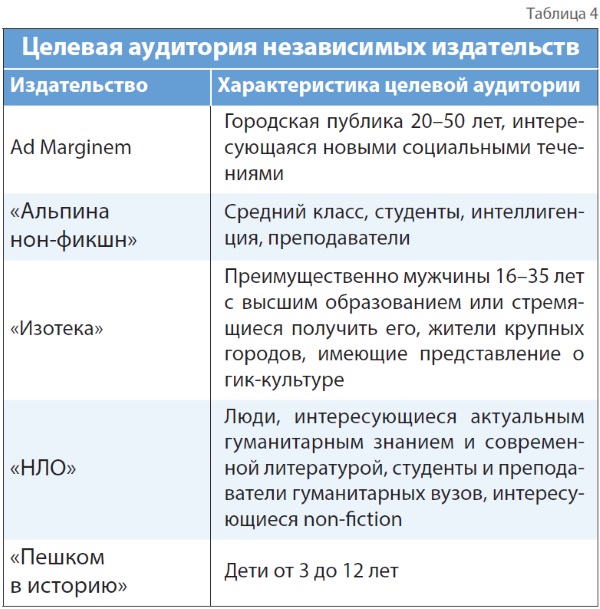 Если владельцы магазинов имеют возможность ежедневно наблюдать за теми, кто покупает у них книги, то издатели её лишены. Этот пробел им приходится восполнять общением на ярмарках и в соцсетях. Тем не менее представление о читателе у многих достаточно чёткое (табл. 4).