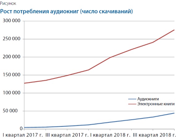 Сегодня ситуация меняется кардинально. Совершенствуются сервисы, меняются формы подачи и потребления контента, пересматриваются подходы к публикации и монетизации. По оценкам экспертов, совокупный объём рынка электронных и аудиокниг в 2018 г. составил 5,44 млрд рублей. В его ассортименте более 1 млн наименований на 50 языках. Из них около 300 тыс. электронных и 30 тыс. аудиокниг предлагаются на русском языке. Выручка сервиса «ЛитРес» за счёт реализации электронного контента выросла на 56%. Важный тренд — увеличение продаж аудиокниг, доля которых в структуре розницы онлайн-сервиса составила 25%; доля самиздата превысила 4% оборота.