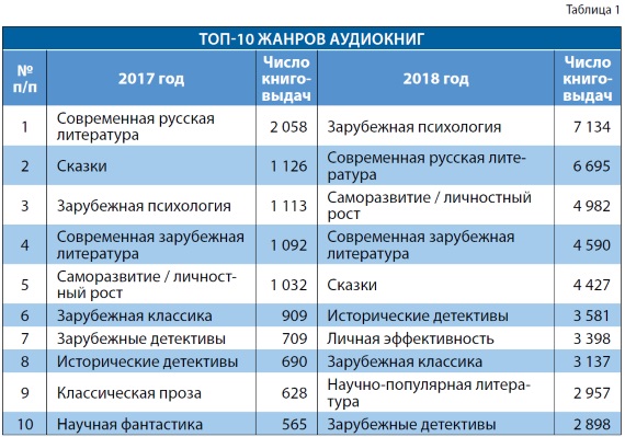 Важно отметить, что рейтинги жанров различаются в зависимости от формата: люди традиционно предпочитают слушать сказки, а также деловую литературу, книги по саморазвитию и личностному росту, психологии, читать — любовные романы и фэнтези, которых нет в топе жанров для аудиокниг (табл. 1 и 2).