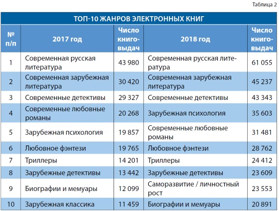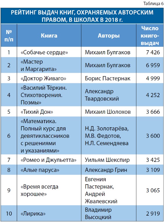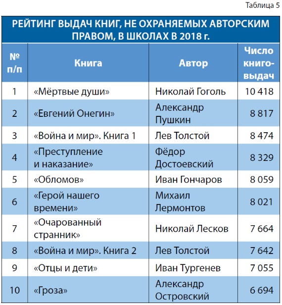 Если же сравнивать книговыдачи классической литературы и произведений современных авторов, то в 2018 г. 59% пришлось на классику, 41% — на современные книги.