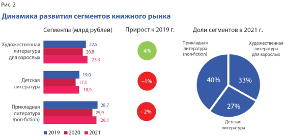 Лучше всего обстоит дело с художественной литературой, которая меньше всего пострадала за этот период (рис. 2). Кроме того, она была одним из элементов, балансирующих рынок. Потребление в электронном и аудиоформатах в данном сегменте растёт.