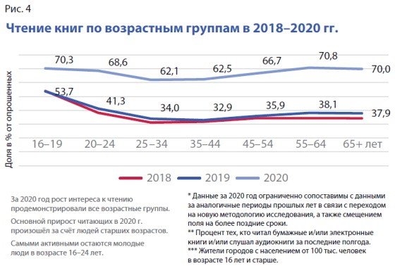 Исследования показывают, что практически в два раза выросла читательская активность, объём чтения среди молодёжи увеличивается. Активные читатели — это молодёжь в возрасте 16–24 лет (рис. 4).