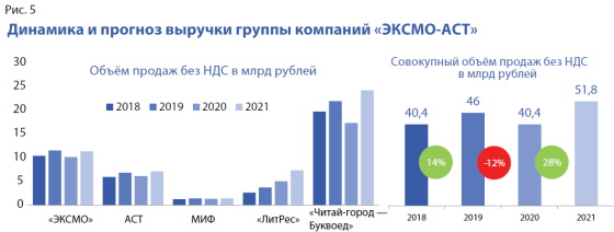 По словам О. Новикова, для группы «ЭКСМО-АСТ» год оказался неровным: если «ЛитРес» продолжал устойчиво расти — на 35% к 2019-му, то объёмы ОРС «Читай-город — Буквоед» значимо упали и общие продажи компании в результате сократились на 12% (рис. 5).