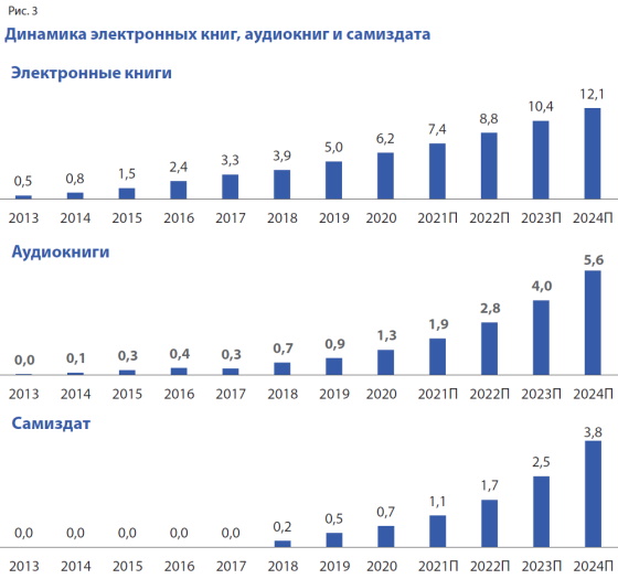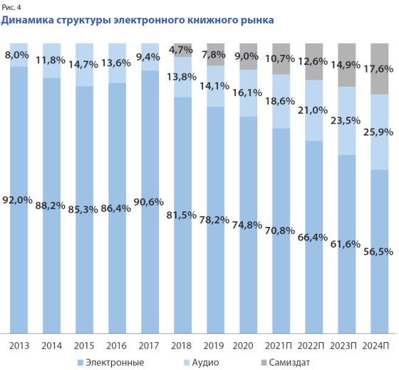 Очевидно, что традиционные э-книги будут терять свою долю, аудиокниги — наращивать, но самым драматическим образом станет развиваться самиздат (рис. 4).