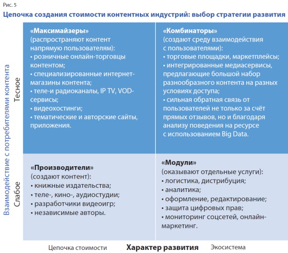 Анализ и перспективы рынка отражает схема (рис. 5). Классические издатели здесь — левый нижний квадрат: демонстрируют слабое взаимодействие с потребителями контента при длинной цепочке формирования стоимости. Над ним довлеют «максимайзеры» — торговцы контентом, в основном интернет-магазины. Кроме того, авторы уходят на сайты и начинают продавать свой контент самостоятельно. Там же активизируется самиздат, разрушая классическую издательскую модель.