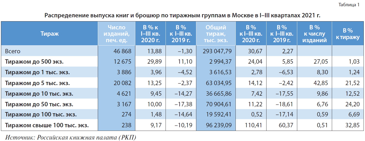 Средний тираж книг и брошюр с московским импринтом в январе — сентябре 2021 г. составил 6253 экз. при среднеотраслевом показателе в 4150 экз., а распределение выпуска книг и брошюр по тиражным группам характеризуют данные табл. 1.