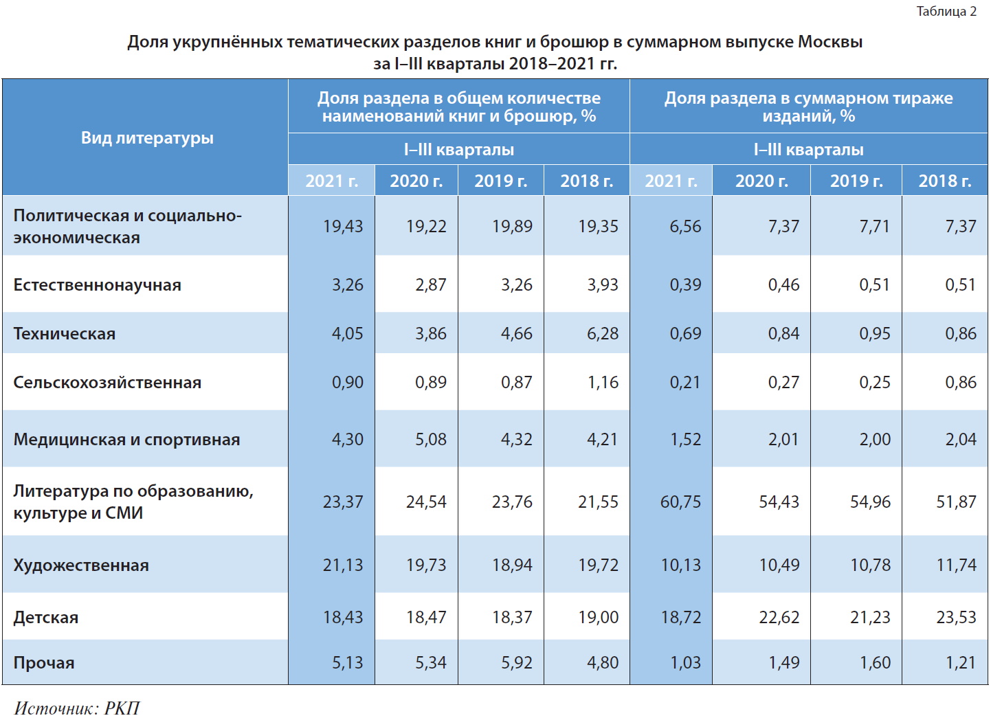 По данным РКП, в первые девять месяцев 2021 г. заметное снижение издательских инвестиций зафиксировано в сегменте технической литературы. На фоне аналогичного периода 2020 г. потери составили 1077 наименований и 16,5% суммарного тиража. Как и в 2020-м, за I–III кварталы 2021 г. серьёзно по количеству проектов и суммарному тиражу сокращается выпуск детской литературы (–370 наименований и –10,7 млн экз.). И наоборот, книги по вопросам образования и культуры приросли в объёме выпуска на 730 наименований и на 23% в суммарном тираже (до 178 млн экз.). Растёт и выпуск художественной литературы (+552 наименования), хотя тираж сегмента сократился на 3 млн экз. Наибольшие потери в тиражности в 2021 г. отмечаются в небольшом по объёму блоке сельскохозяйственной литературы, где суммарный выпуск снизился в четыре раза (с 2,4 млн экз. до 600 тыс.). Основные данные столичного книжного выпуска по сегментам представлены в табл. 2.
