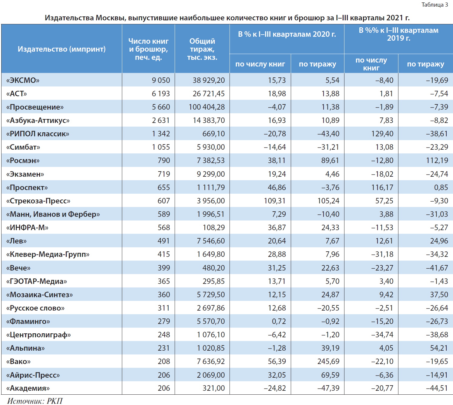 В то же время по итогам трёх кварталов 2021 г. фактически все (81% топ-25) лидеры коммерческого книгоиздания Москвы так и не восстановились по суммарному тиражу к допандемийному уровню. Положительная динамика этого показателя отмечается главным образом у издателей, специализирующихся на выпуске детской книги: «Росмэна», ИД «Лев», «Мозаики-Синтез». Впрочем, многие другие издатели детской литературы («Клевер-Медиа-Групп», «Фламинго»), напротив, продемонстрировали фактически полное отсутствие восстановительных процессов в 2021 г., сократив свой выпуск на 20% и более на фоне 2019-го.