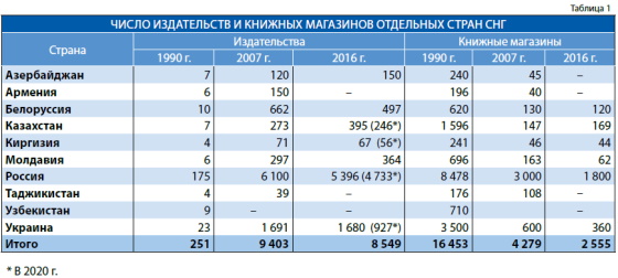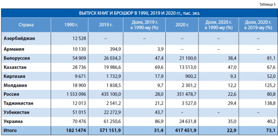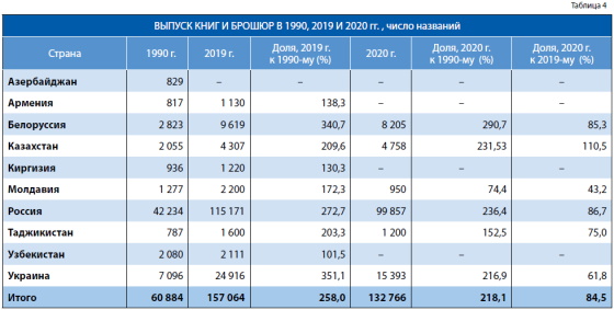Так, выпуск книг и брошюр по названиям в Белоруссии, Киргизии, Казахстане, Молдавии, Российской Федерации, Таджикистане и на Украине в 2020 г. превысил показатели 1990-го в 2,17 раза. Но в сравнении с 2019 г. этот показатель уменьшился на 15%. Особенно резкое сокращение выпуска книг и брошюр произошло на Украине, в Таджикистане и Молдавии. По тиражам картина ещё менее позитивная. В 2019 г. выпуск книг и брошюр в Белоруссии, Казахстане, Киргизии, Молдавии, Российской Федерации, Таджикистане и на Украине составил к уровню 1990-го всего 31,36%, а в 2020 г. тиражи снизились ещё почти на 22,9% (73,09% к уровню 2019 г.).