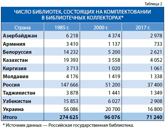 30 лет назад Советский Союз считался самой читающей страной в мире. Из данных, приведённых в табл. 6, можно увидеть, что в СССР издавалось в год более семи книг на одного жителя. При этом в Российской Федерации издавалось 10,518 книги, в Армении — 5,88, в Белоруссии — 5,38, в Молдавии — 4,33 книги на душу населения. В настоящее время в Российской Федерации этот показатель равен 3,011, в Белоруссии — 2,745, на Украине — 1,459. В остальных республиках СНГ издаётся за год менее одной книги на душу населения.