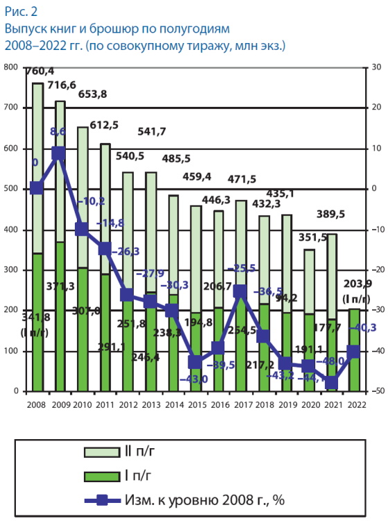 Подводя итоги развития российской книгоиздательской отрасли в 2021 г., мы отмечали, что она начала постепенный выход из «ковидного» кризиса, показав достаточно неплохие результаты. И несмотря на то что докризисных (2019 г.) значений в 2021 г. индустрия так и не достигла, она вернулась в русло своей обычной динамики.