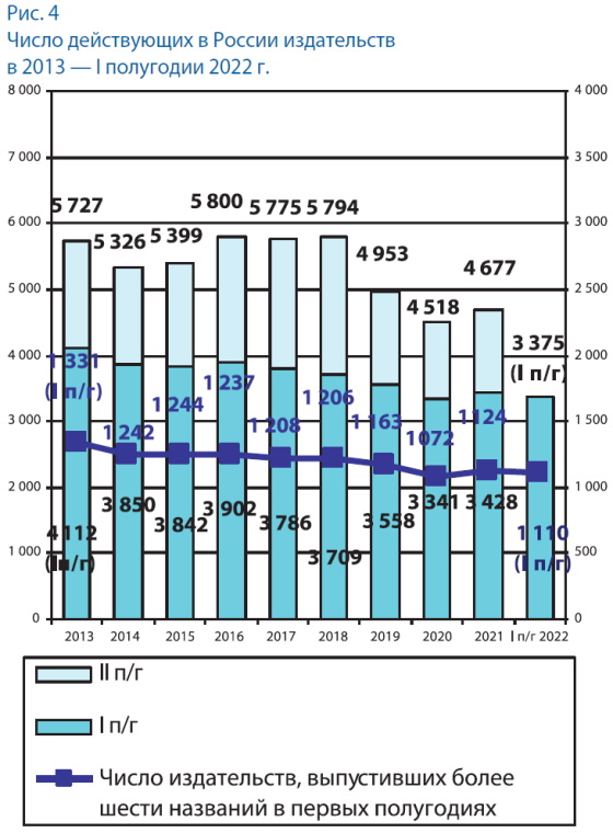 В I полугодии 2022 г., по данным РКП, в стране была зарегистрирована деятельность 3375 издательств, что на 1,5% меньше, чем в аналогичном периоде 2021-го (3428). Число активно действующих издательств, к которым мы традиционно относим организации, выпускающие в среднем не менее одной книги в месяц (т.е. выпустивших в I полугодии 2022 г. не менее шести названий книг и брошюр), составило 1110. По отношению к I полугодию 2021 г. (1124 издательства) число активно действующих издательств сократилось на 1,2% (рис. 4).