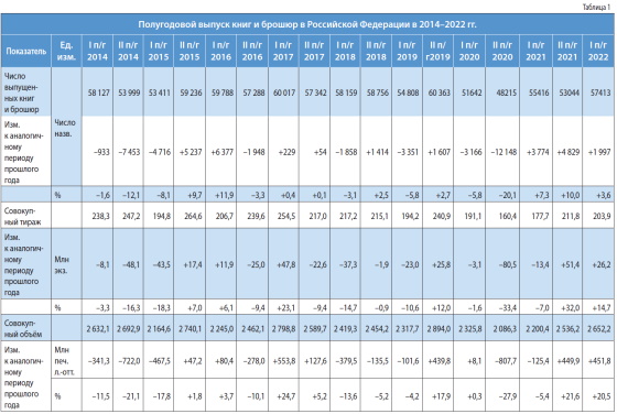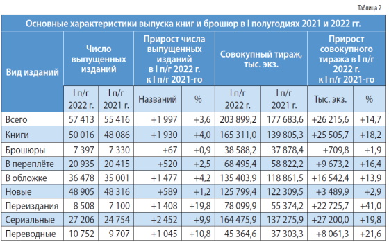 По данным РКП, в I полугодии 2022 г. в России было выпущено 57 413 названий книг и брошюр общим тиражом 203,9 млн экз. и совокупным листажом 2652,2 млн печ. л.-отт. В сравнении с аналогичным периодом прошлого года число выпущенных в стране названий увеличилось на 3,6%, их общий тираж — сразу на 14,7%, а совокупный листаж — на 20,5% (табл. 1). Такого роста, пожалуй, не ожидали даже самые большие оптимисты. При этом поражает, что резко вырос именно тираж и листаж книг при относительно небольшом увеличении числа выпущенных названий.