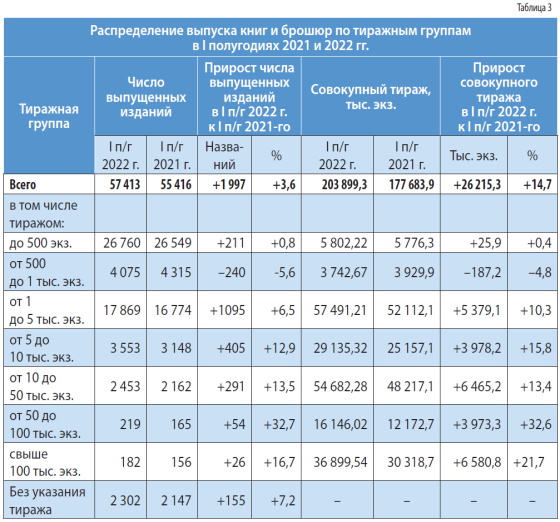 Как видно из таблицы, во всех тиражных группах, за исключением тиражной группы «От 500 до 1 тыс. экз.», в I полугодии 2022 г. в сравнении с аналогичным периодом 2021-го наблюдается рост как по числу выпущенных названий, так и по совокупному тиражу.