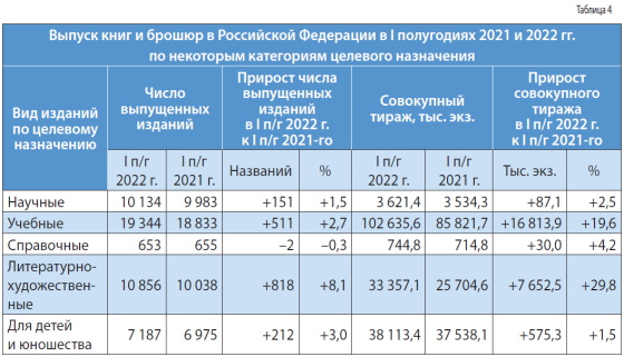 Динамика выпуска основных видов литературы в I полугодии 2022 г. представлена в табл. 4. Как видно из таблицы, по числу выпущенных названий наблюдается рост во всех сегментах литературы, за исключением справочных изданий (где падение по числу названий составило 0,3%). Наибольший рост по числу выпущенных названий (+8,1%) продемонстрировал раздел художественной литературы.