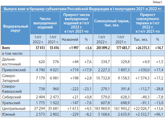 Анализ выпуска книжных изданий по субъектам Российской Федерации в I полугодии 2022 г. в сравнении с аналогичным периодом 2021 г. представлен в табл. 5. Как видно из таблицы, наибольший рост по числу выпущенных названий зафиксирован в Приволжском федеральном округе (+17,9%), а по тиражам — в Южном (+96,1%), Приволжском (+17,4%) и Северо-Западном (+17,2%) федеральных округах. Поражает почти стопроцентный прирост тиражей книг и брошюр, выпущенных на Юге России!