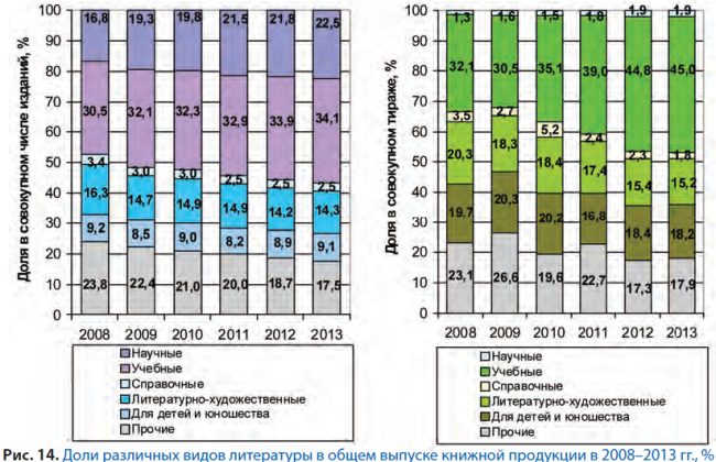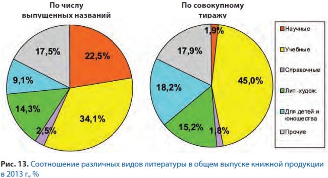 По тиражным показателям отмечается увеличение доли учебной (на 12,9%) и научной (на 0,6%) литературы на фоне снижения доли тиражей изданий для детей (на 1,5%), литературно-художественных (на 5,1%) и справочных (на 1,7%) изданий.