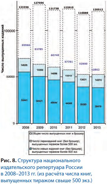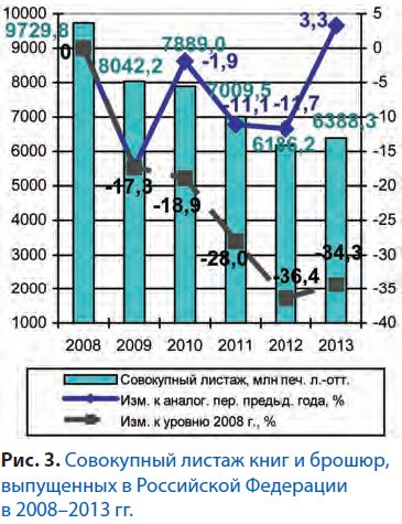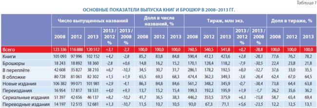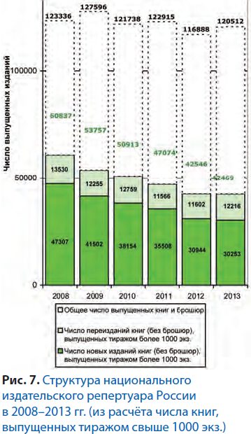 В целом за 2008–2013 гг. выпуск изданий, выходящих тиражом от 5 до 50 тыс. экз., т.е. составляющих основу массового книгоиздания, сократился почти на 40% по числу выпущенных названий и на 35% – по тиражам.
