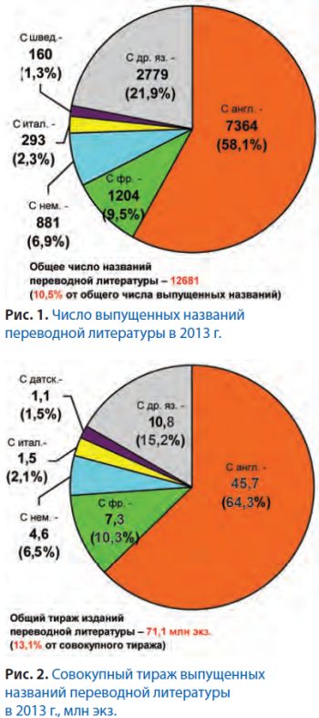 Кроме того, в 2013 г. в России было издано 1290 названий книг в переводе с русского на другие языки общим тиражом 2761,9 тыс. экз. (в 2012 г. – 1242 наименования общим тиражом 3554,5 тыс. экз.).
