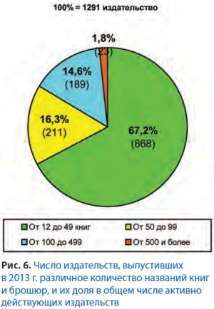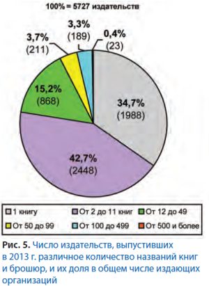 Сегодняшняя издательская система России представлена, в подавляющем большинстве, мелкими и средними компаниями. Так, из 5727 действующих в России издательств более трети (34,7%) – это издающие организации, выпустившие в 2013 г. всего лишь одну книгу (рис. 5). Издательства, выпустившие меньше 12 книг за год (т.е. в среднем менее одной книги в месяц), составляют более 3/4 (77,4%) всех издающих организаций, зарегистрированных в России. И лишь менее 1% издательств выпускают более 500 названий книг в год.