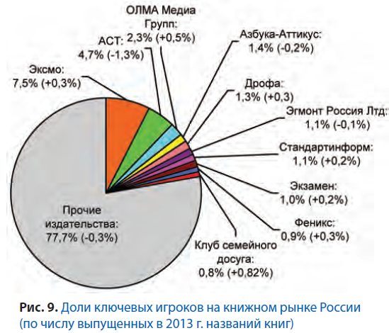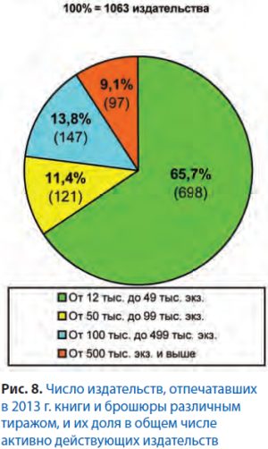 По сравнению с 2012 г. число издающих организаций в России сократилось на 2,7%. При этом число издательств, выпустивших в 2013 г. 12 и более книг и брошюр, сократилось по сравнению с 2012 г. на 2,5%, а число издательств, совокупный тираж которых в 2013 г. превысил 12 тыс. экз., сократилось по сравнению с тем же периодом на 8,8%. При этом в сравнении с 2008 г. число издательств, совокупный тираж которых превысил 12 тыс. экз., сократилось к настоящему времени на 26,2%.