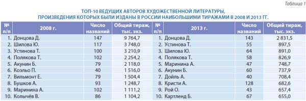 Самым печатаемым автором художественной литературы в России на протяжении уже многих лет является Дарья Донцова. Общий тираж её книг, выпущенных в 2013 г., составил 2831,5 тыс. экз. Однако в сравнении с предкризисным 2008 г. этот показатель сократился почти в 3,5 раза (в 2008 г. – 9764,7 тыс. экз.). То же можно сказать и о других авторах, входящих в рейтинг (Татьяна Устинова: 2008 г. – 3210,9 тыс. экз., 2013 г. – 897,5 тыс. экз.; Юлия Шилова: 2008 г. – 3748,0 тыс. экз., 2013 г. – 891,0 тыс. экз. и т.д.). При этом среди авторов женской прозы лишь Дарья Донцова сохранила свой прежний творческий потенциал: 143 названия в 2013 г., что практически равно 147 названиям в 2008 г. Остальные же лидеры рейтинга сократили объёмы своей деятельности примерно вдвое.