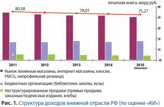 Растёт сегмент электронной книги, который в 2013 г. составил более 1 млрд рублей. К 2015 г. эксперты прогнозируют рост сегмента до 1,9 млрд рублей, из которых 1 млрд рублей обеспечит массовый рынок, 0,9 млрд – b2b-сегмент, в основном школы, которым Минобрнауки России предписывает обязательное комплектование электронными учебниками. Однако в целом в 2014–2015 гг. сокращение книжного рынка будет ощутимым: обострятся внутренние проблемы, прогнозируется существенное ухудшение ситуации по стационарным книжным магазинам.