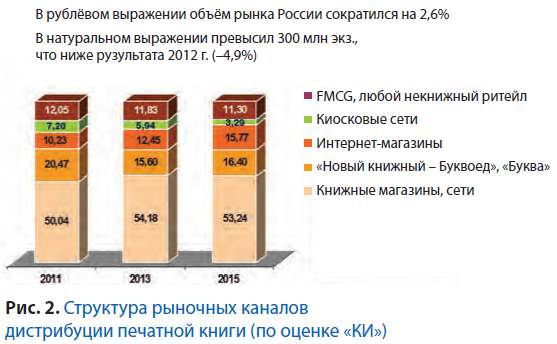 54% рыночного оборота приходится на независимые книжные магазины, 15,6% – на федеральные сети «Новый книжный – Буквоед», «Буква» и др., 12,4% – на интернет-магазины. Около 6% занимают киосковые сети, 11,8% – FMCG-ритейл. В 2013 г. по сравнению с 2011 г. немного улучшилась ситуация с независимыми магазинами и интернет-торговлей, но произошло серьёзное сокращение в сегменте федеральных сетей.