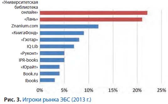 Что касается ЭБС, то активный рост сегмента – на уровне 100% в год – наблюдался в первые годы его формирования, сейчас рост замедлился и находится на уровне 60–90% в год. Связано это, в первую очередь, с бюджетными ограничениями. Тем не менее, рост рынка ЭБС в 2013 г. достиг 450 млн рублей.