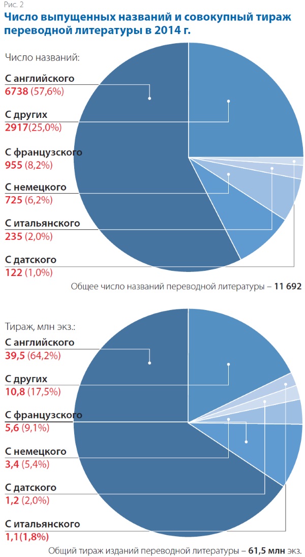 Популярный сегодня термин «импортозамещение» применим и к книгоизданию. На российском рынке переводные произведения составляют около 10% по названиям и около 13% — по тиражам. В основном переводят с английского (около 60%), французского, немецкого и итальянского (рис. 2). Больше всего переводов в сегментах художественной литературы (30% по названиям, 41% по тиражам) и книг для детей (22% по названиям, 20% по тиражам).