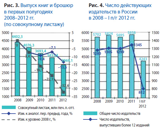 В первом полугодии 2012 г., по данным Российской книжной палаты, в стране действовали 4243 издательства. Это на 1,8% меньше, чем функционировало в первом полугодии 2011 г., и примерно на 30% меньше, чем обычно «заявляет о себе» отрасль по итогам всего года (рис. 4). Остаётся лишь надеяться, что «молчавшие» доселе издательства проявят себя во втором полугодии 2012 г., а 40% «активных» издательств, пока выпустивших менее 12 книг и брошюр, к концу года нарастят свой выпуск до 12 и более названий.