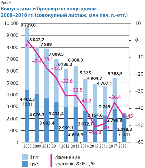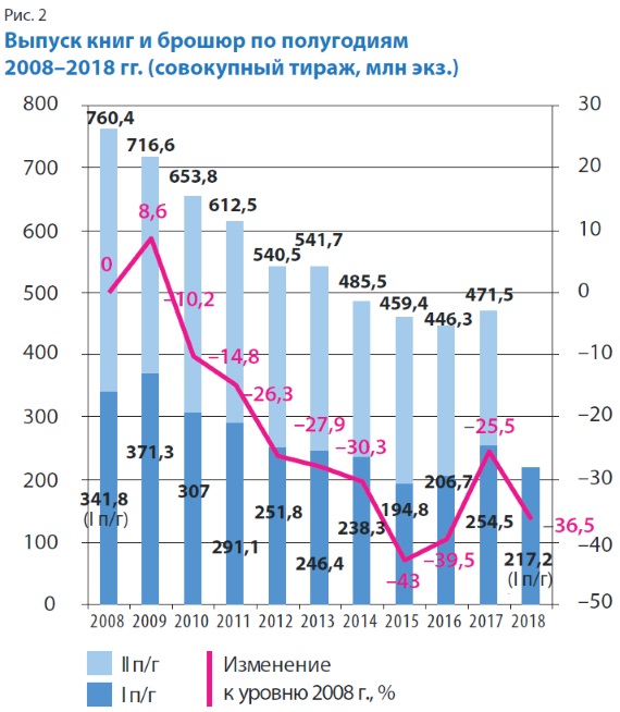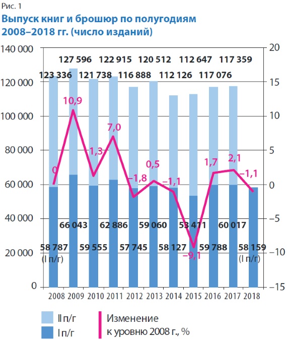 Как показывает анализ рис. 1, число выпущенных в России книг и брошюр в I полугодии 2018 г. было не только выше, чем за тот же период кризисных 2014 и 2015 гг., но и больше, чем в ещё условно благополучном 2012-м, хотя в сравнении с аналогичным периодом базового для нашего анализа 2008 г. оно снизилось на 1,1%.