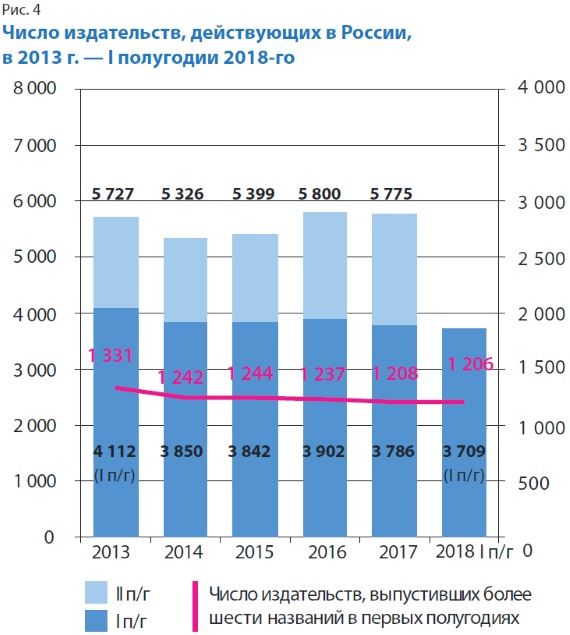 В I полугодии 2018 г., по данным Российской книжной палаты, в стране была зарегистрирована деятельность 3709 издательств (рис. 4), что на 2% меньше, чем в аналогичном периоде 2017-го (3786 издательств). Число активно действующих издательств, к которым мы традиционно относим организации, выпускающие в среднем не менее одной книги в месяц (т.е. выпустившие в I полугодии 2018 г. не менее шести названий книг и брошюр), составило 1206. По отношению к I полугодию 2017 г. (1208 издательств) число их практически не изменилось.