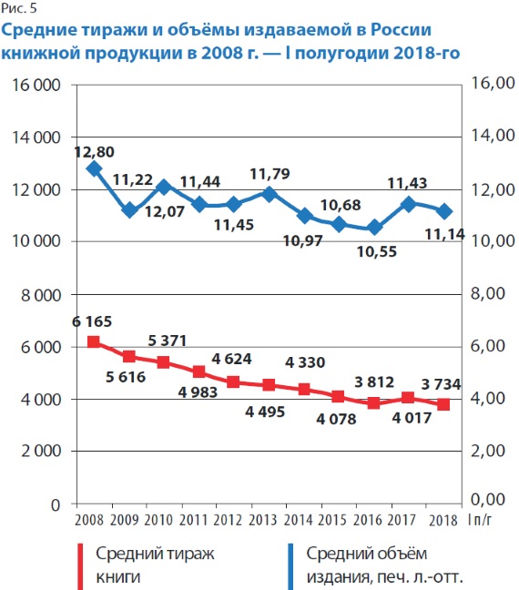 Если предположить, что во II половине 2018 г. отечественная издательская отрасль будет развиваться такими же темпами, как и в первой, то по результатам полного 2018-го можно будет ожидать некоторого снижения книжного выпуска по отношению к уровню 2017 г.: около 116 тыс. названий книг и брошюр, отпечатанных тиражом 430–435 млн экз., совокупный печатный объём которых составит примерно 4,84 млрд печ. л.-отт. И если по количеству выпущенных названий и совокупному листажу показатели удержатся в пределах границ, зафиксированных в последние годы, то вот по совокупному тиражу такой сценарий означает обновление минимумов последнего 11-летия.